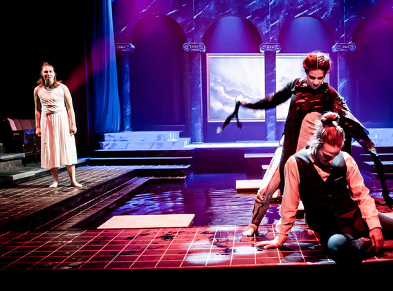 For this look, the costume designer, Maddy Simpson, and I had to work together on how to make the circle cape also become wings. The original fabric that was bought for the chiton was severely shrunk in the dyeing process. The designer and her mentor went out and bought crepe back stain and we decided to use the non-shiny side of the fabric. The circle cape needed to be able to wrap around the torso and then hook to the back of chiton. I accomplished this by sewing down the under lap of cape at the shoulder and then having a snap on the back of the other shoulder for the overlap of the cape.