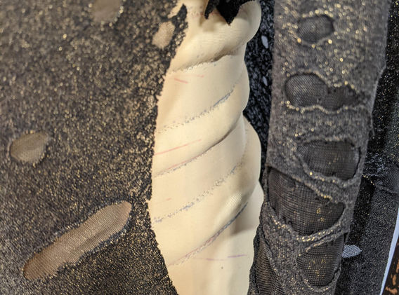 After finishing the first fitting with the mock up unitard, Hunger's costume departed from Iris's. Hunger costumes consisted of three parts: a unitard with trapunto quilting details, an dress sewn to the unitard, and a 14' long cape. To create the bone detail, the unitard has two layers of spandex flat lined together. Then, once the placement of the bones is figured out, the shape was stitched through both layers. Finally a small hole is cut in the inner layer of spandex and stuffed. It creates a lovely 3D detail in the unitards.